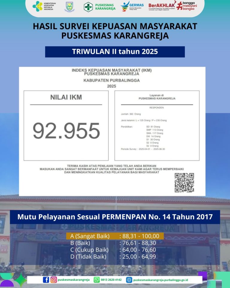 Karangreja, 1 JULI 2025 – UPTD Puskesmas Karangreja kembali menegaskan komitmennya terhadap pelayanan kesehatan berkualitas tinggi dengan meraih kategori SANGAT BAIK dalam Survei Kepuasan Masyarakat (SKM) triwulan kedua tahun 2025. Dengan nilai Indeks Kepuasan Masyarakat (IKM) sebesar 92,955, Puskesmas Karangreja berhasil mempertahankan standar pelayanan prima yang telah ditunjukkan sebelumnya. Survei yang diselenggarakan selama periode 1…